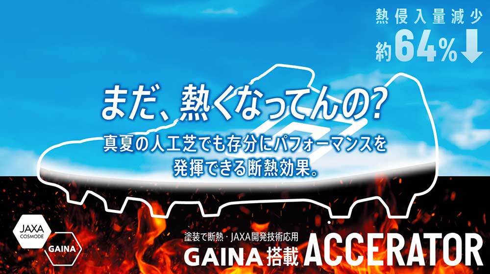夏場の人工芝のグラウンドは、表面温度が70℃近くまで上昇し、プレーヤーの足裏に熱によるダメージを与えることがあります。そのためACCERATORには、高い断熱効果を発揮する塗料である「GAINA(ガイナ)」を国内で初めてシューズに搭載。従来のサッカースパイクに比べ、シューズ内への熱侵入量を約64%減少させることができます。