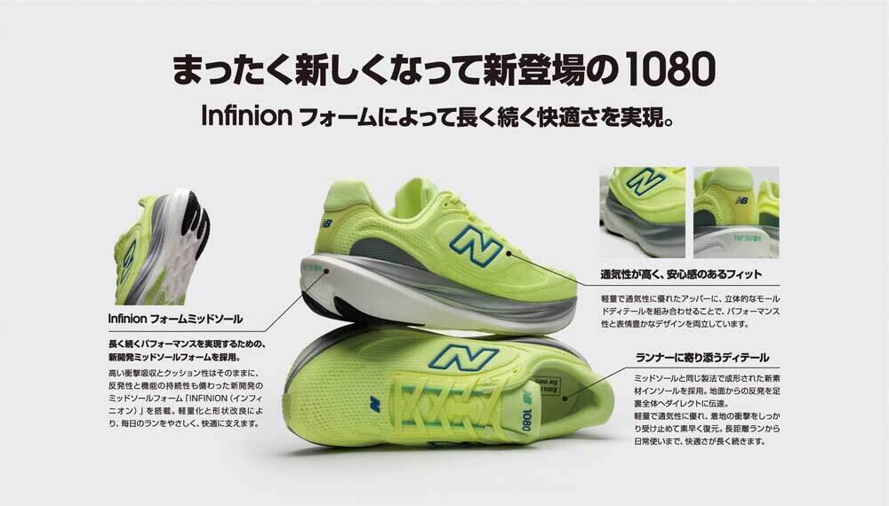 ■1080v15は、長時間のパフォーマンスを支えるために、クッション性とエネルギーリターンを強化した全く新しいミッドソールテクノロジー「Infinion」を採用しています。